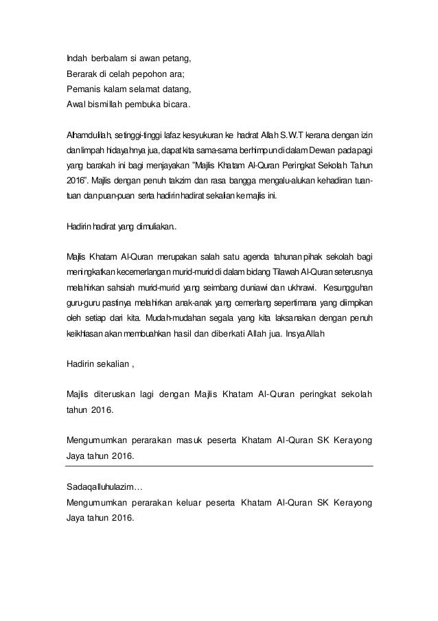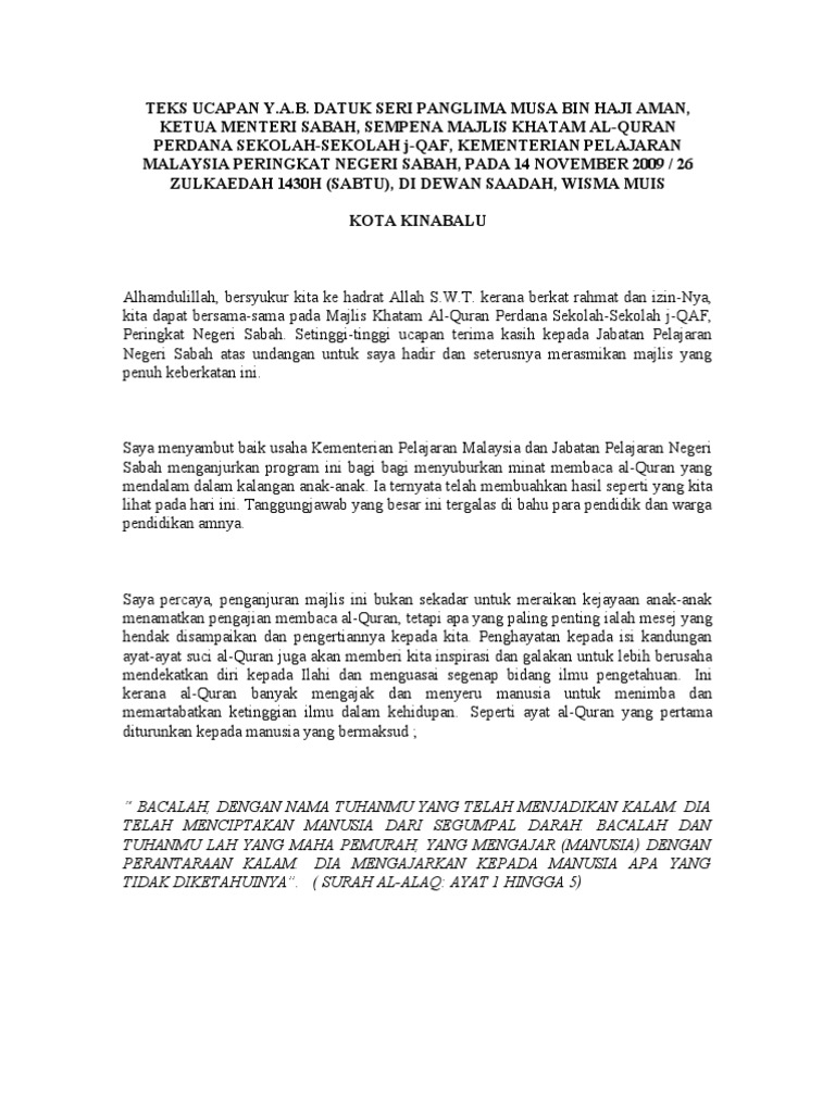 Juga sesuai diubahsuai untuk program sambutan lain dan juga peringkat daerah serta kebangsaan. Related posts to teks ucapan majlis penutup khatam al. Teks Ucapan Majlis Khatam Al Quran.