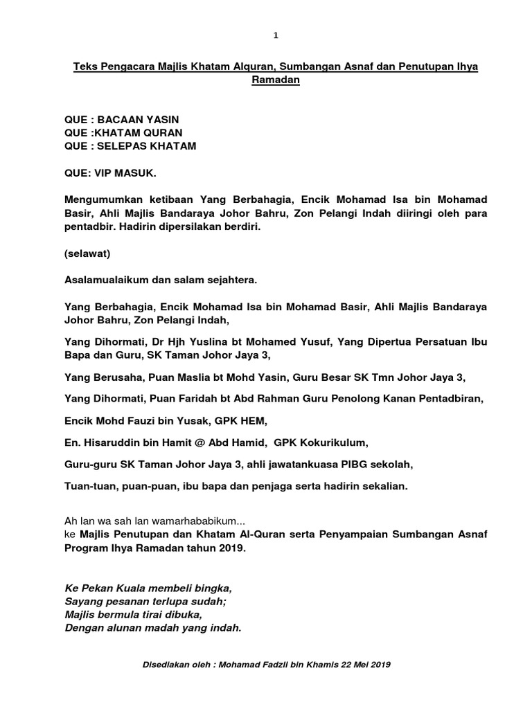 22 Full PDFs related to this paper. Teks Pengacaraan Majlis Khatam Alquran. Manakala program sesi petang adalah Majlis Iftar Jamaie dan Solat Terawih sesi 2019H1440M.